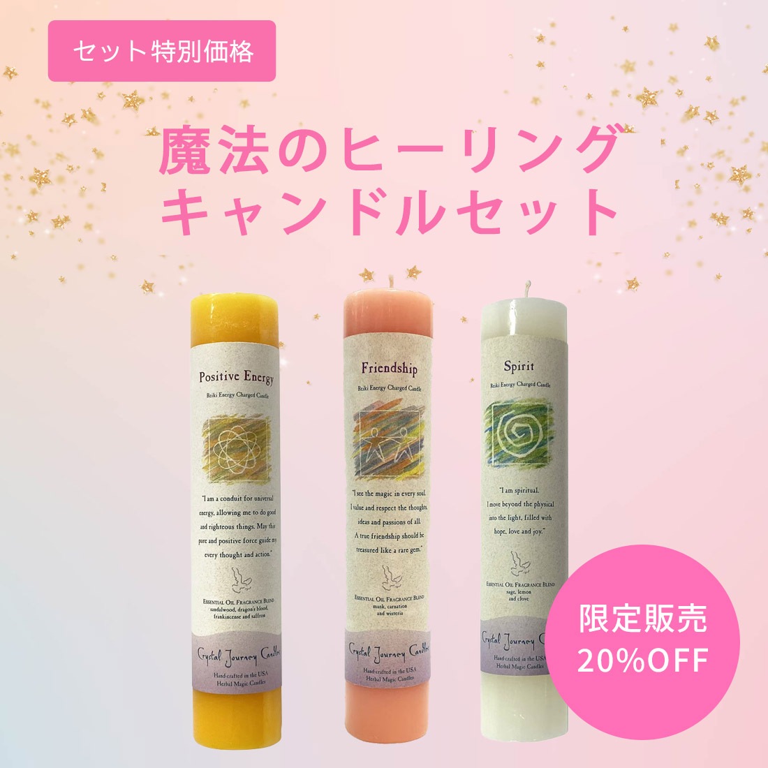 レイキ・エネルギーの込められた、『魔法のヒーリングキャンドル』シリーズは、それぞれ素敵なエッセンシャルオイルで香り付けされています。